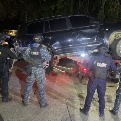 Aseguran cuatro vehículos, tres con blindaje, tres armas largas AK-47 y 1 arma larga R15 con aditamento de lanzagranadas Tuxtla