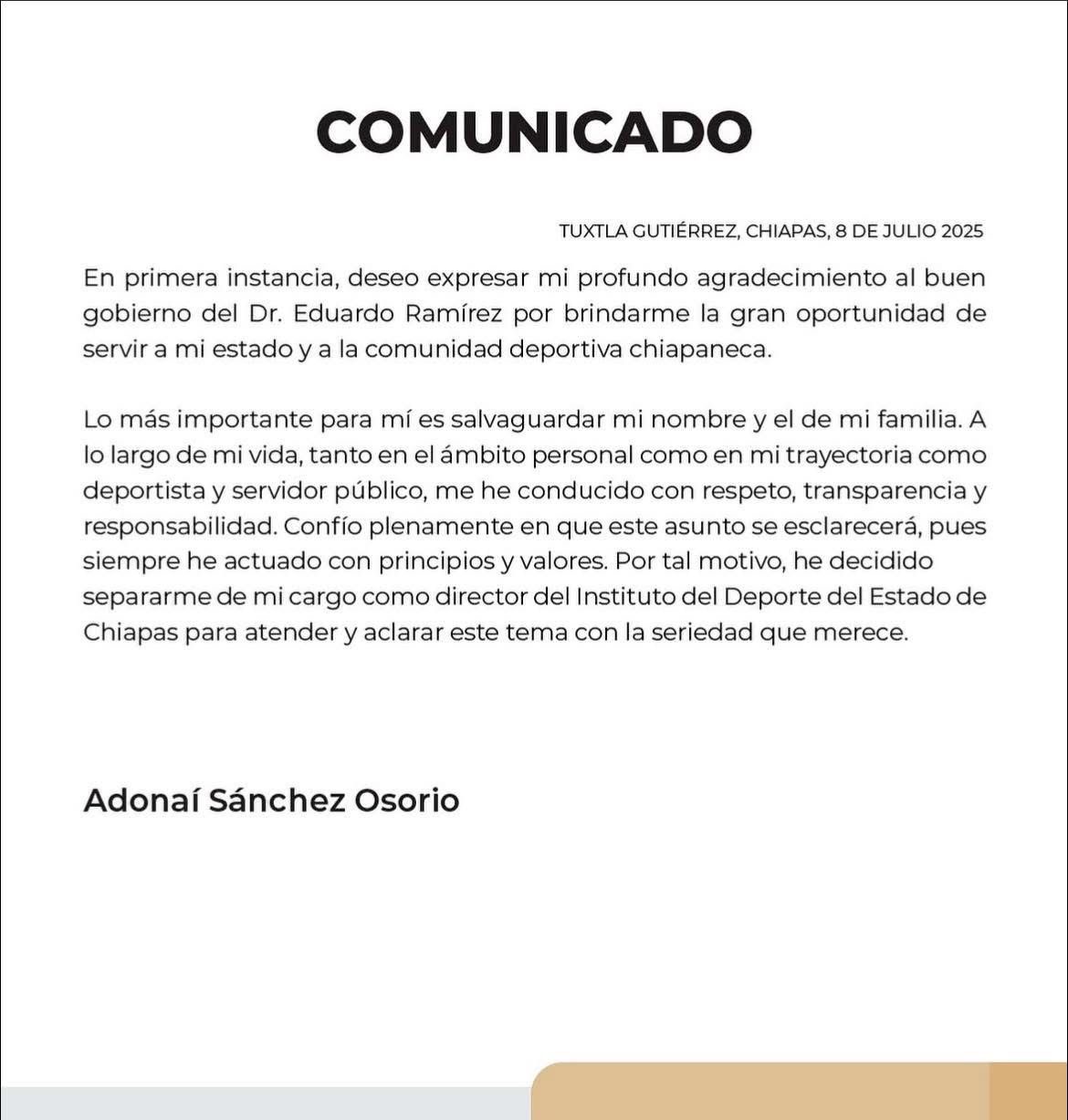 Por la noche, Adonaí Sánchez Osorio, divulgó en sus redes sociales un comunicado, donde asegura que decidió separarse del cargo “para atender y aclarar este tema con la seriedad que merece”. Luego de agradecerle al gobernador Eduardo Ramírez, la oportunidad de servir, dijo que lo más importante es salvaguardar su nombre y el de su familia.