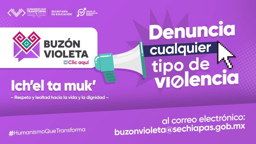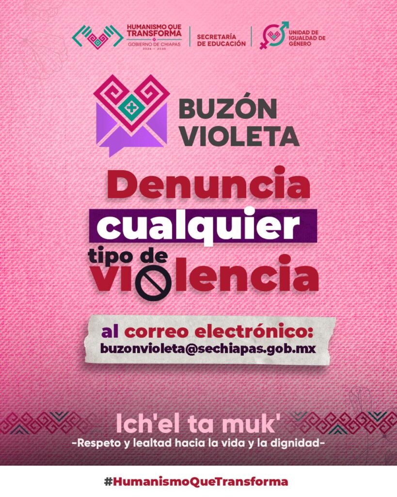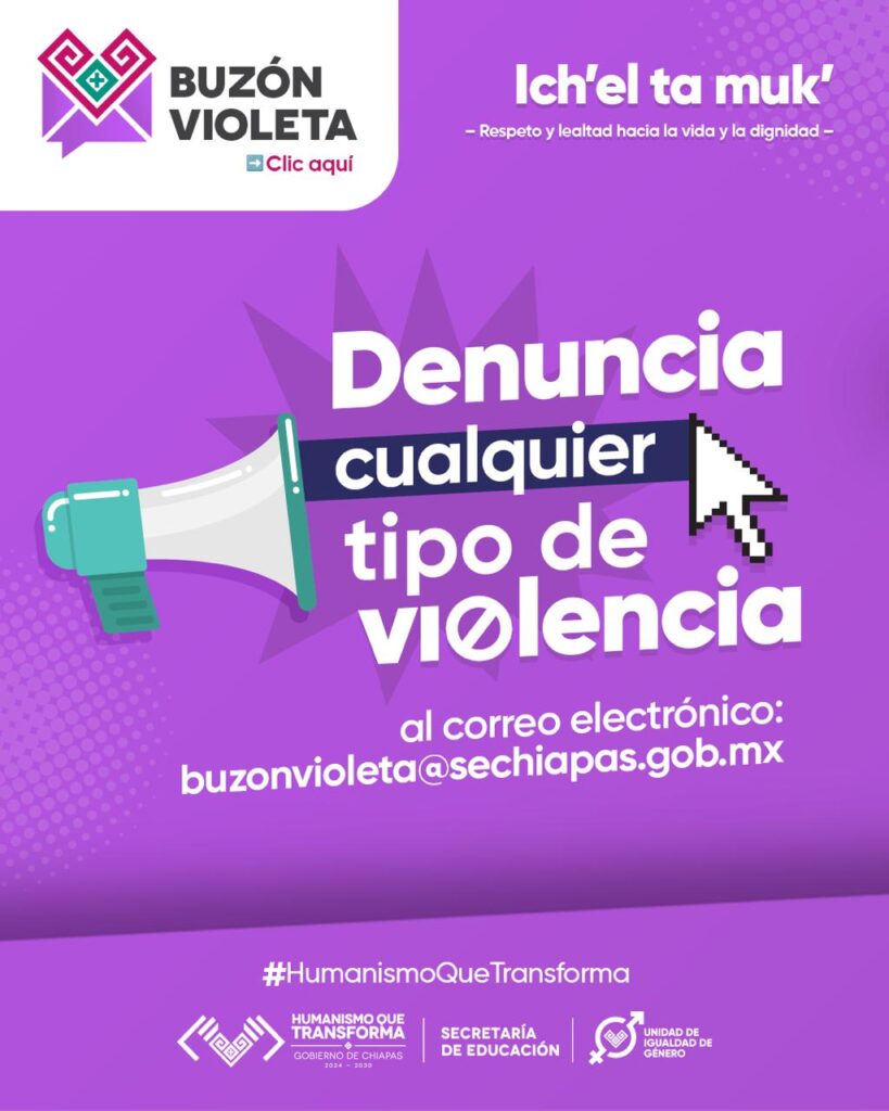 Abundó que el “buzón violeta” tiene como objetivo generar ambientes educativos libres de cualquier forma de violencia cometida en contra niñas, niños, adolescentes y mujeres. “Es un compromiso sentido e imperativo para la Secretaría de Educación del estado de Chiapas. Prevenirla es una tarea esencial que requiere compromiso, empatía y un enfoque integral que atienda sus causas y factores de riesgo”.