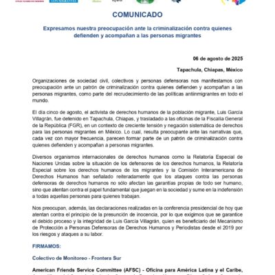 Preocupación por detención de defensor de migrantes en la frontera sur” Tuxtla Gutiérrez, Chis. 7 Agosto.- El Colectivo Monitoreo-Frontera Sur,