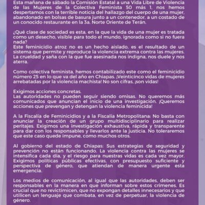 Feminicidio en Tuxtla: Mujer es asesinada y descuartizada por su marido; colectivas exigen justicia y acciones urgentes contra la violencia machista