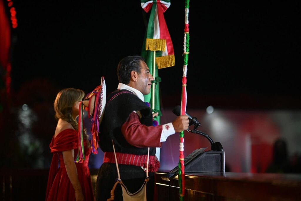 El gobernador inició con los nombres de los próceres nacionales: “¡Viva Miguel Hidalgo y Costilla! ¡Viva Josefa Ortiz! ¡Viva José María Morelos y Pavón! ¡Viva Vicente Guerrero! ¡Viva Leona Vicario! ¡Viva Ignacio Allende!”