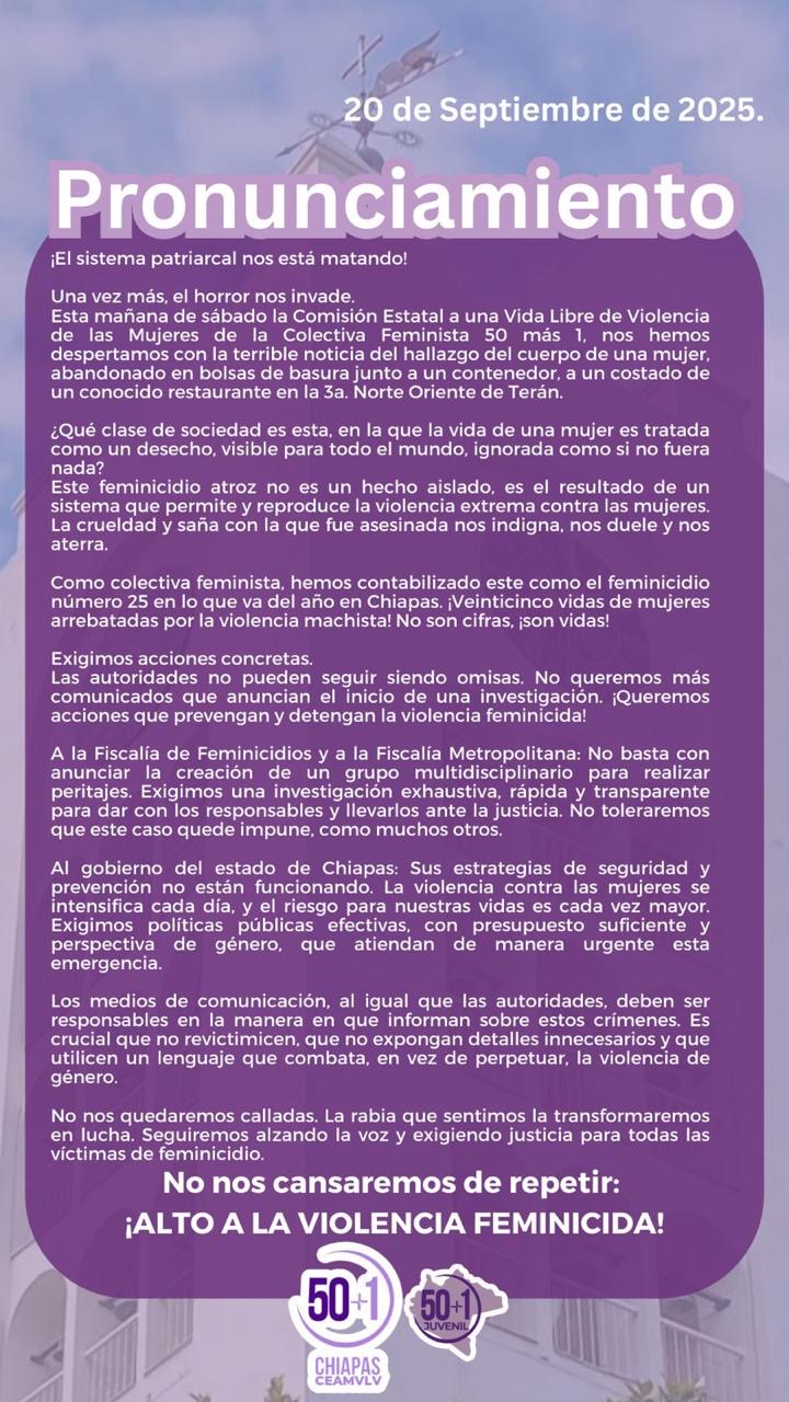 50 más 1, colectiva feminista que lleva un puntual seguimiento de los feminicidios, dijo que el feminicidio atroz de Thalía del Rocío, es el número 25 en lo que va del año en Chiapas, y señaló que el caso “no es un hecho aislado, es el resultado de un sistema que permite y reproduce la violencia extrema contra las mujeres. La crueldad y saña con la que fue asesinada nos indigna, nos duele y nos aterra”.