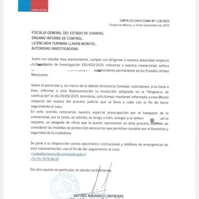 Fredy Martín Pérez. El consulado general de Chile en México pidió a la Fiscalía de Chiapas proporcionar a una de