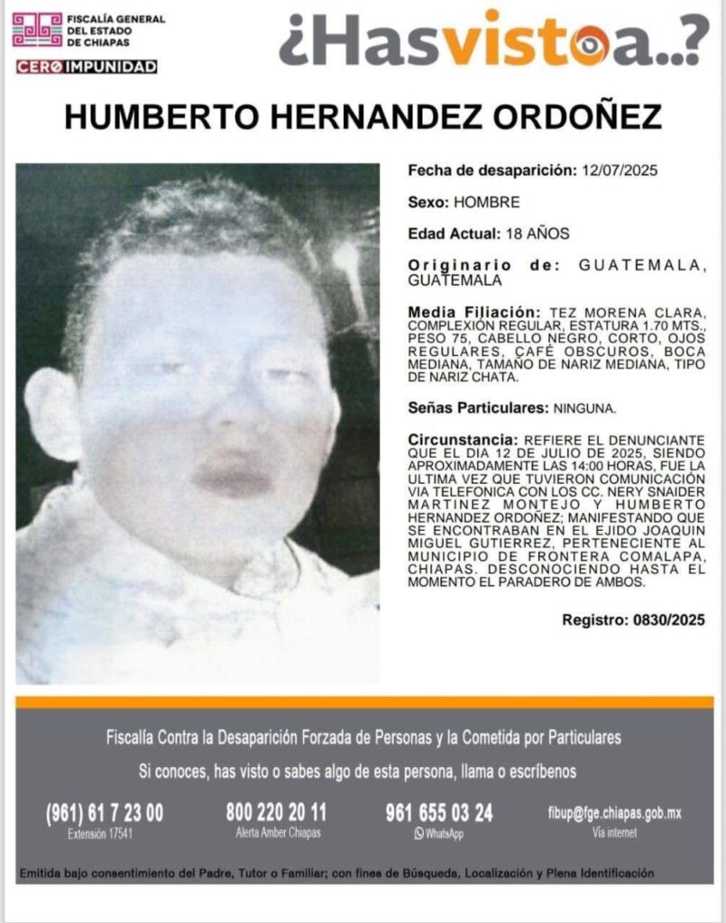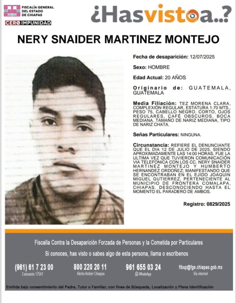 Ambos jóvenes fueron vistos por última vez el pasado 12 de julio de 2025 en el ejido Joaquín Miguel Gutiérrez municipio de Frontera Comalapa alrededor de las 14:00 horas, momento en que fue la ultima comunicación telefónica con ellos.