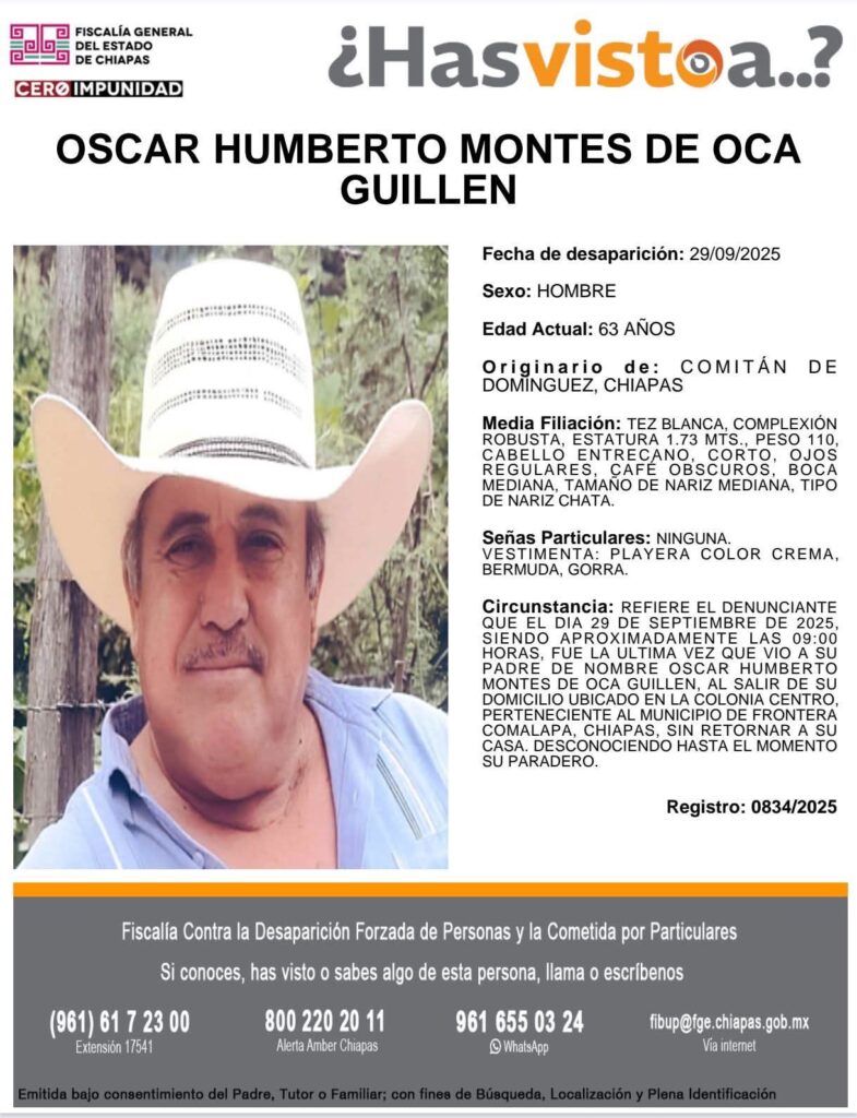 Tuxtla Gutiérrez, Chis. 2 Oct.- La población de Frontera Comalapa Chiapas, cuya cercanía con Guatemala la hace un punto para rutas de tráfico de drogas, migrantes, contrabando y otras mercancías ilícitas-. se encuentra nuevamente en alerta y con una profunda preocupación tras la desaparición del conocido profesor y empresario local, Óscar Humberto Montes de Oca Guillén.
