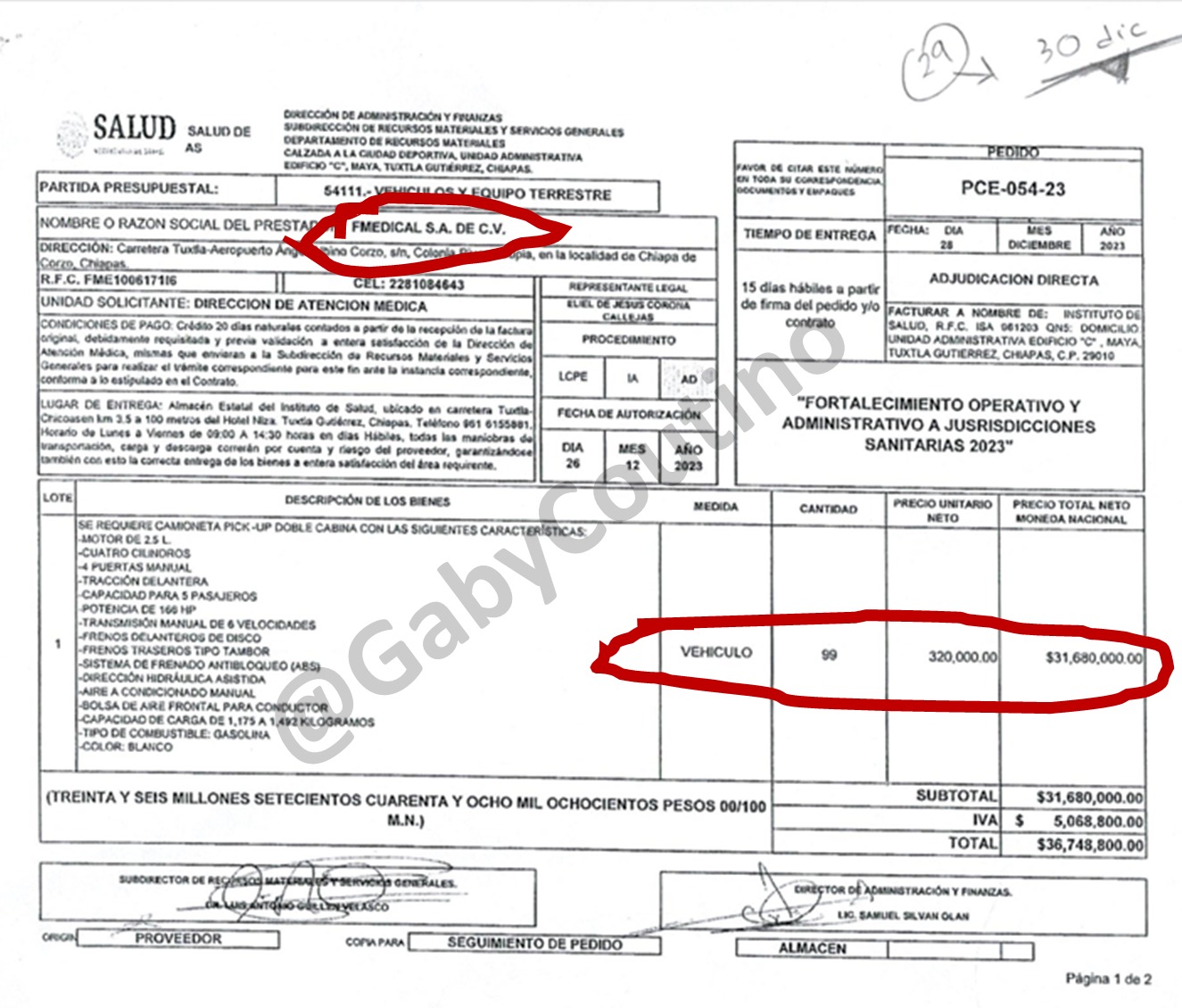 Aún más grave, la documentación revela que los mismos vehículos fueron entregados en comodato a la Secretaría de Salud por la propia empresa FMEDICAL. Es decir, se vendieron y, al mismo tiempo, se prestaron.