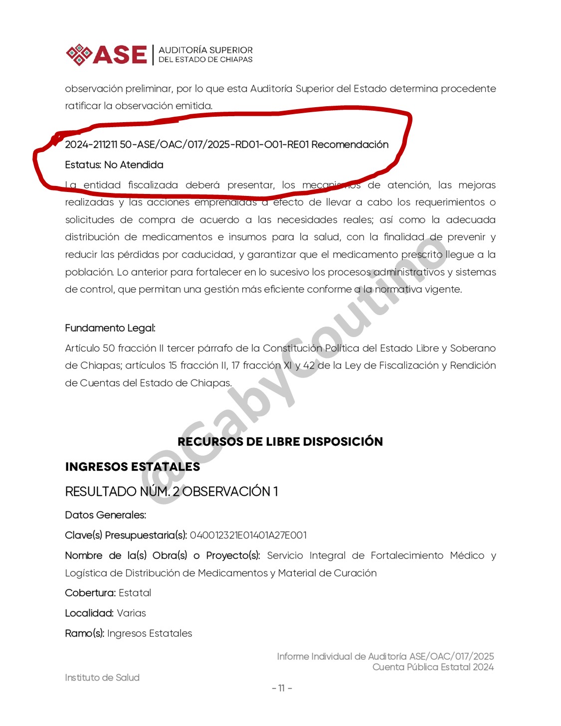 La Auditoría de Cumplimiento ASE/OAC/017/2025 de la Cuenta Pública Estatal del 2025 correspondiente a la Secretaría de Salud del Estado de Chiapas en el resultado número 1 y su observación número 1 también identificó que “la entidad fiscalizada cuenta con un inventario de medicamentos e insumos para la salud con caducidad vencida, constante de 133,177 y 202,357 piezas, respectivamente; adquiridos en los ejercicios 2021, 2022 y 2023”.