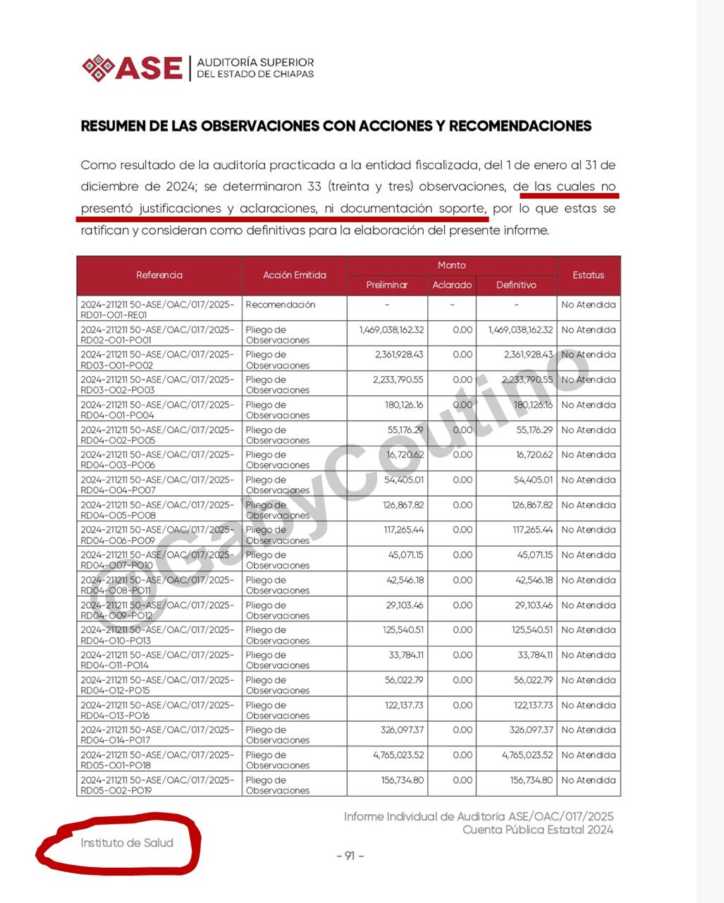 El documento indica que se determinaron treinta y tres observaciones a la gestión en Salud Chiapas. De esas observaciones, no presentó “justificaciones y aclaraciones, ni documentación soporte”, por lo que dichas observaciones se ratificaron y, además -de acuerdo al documento- se consideraron como “definitivas”.