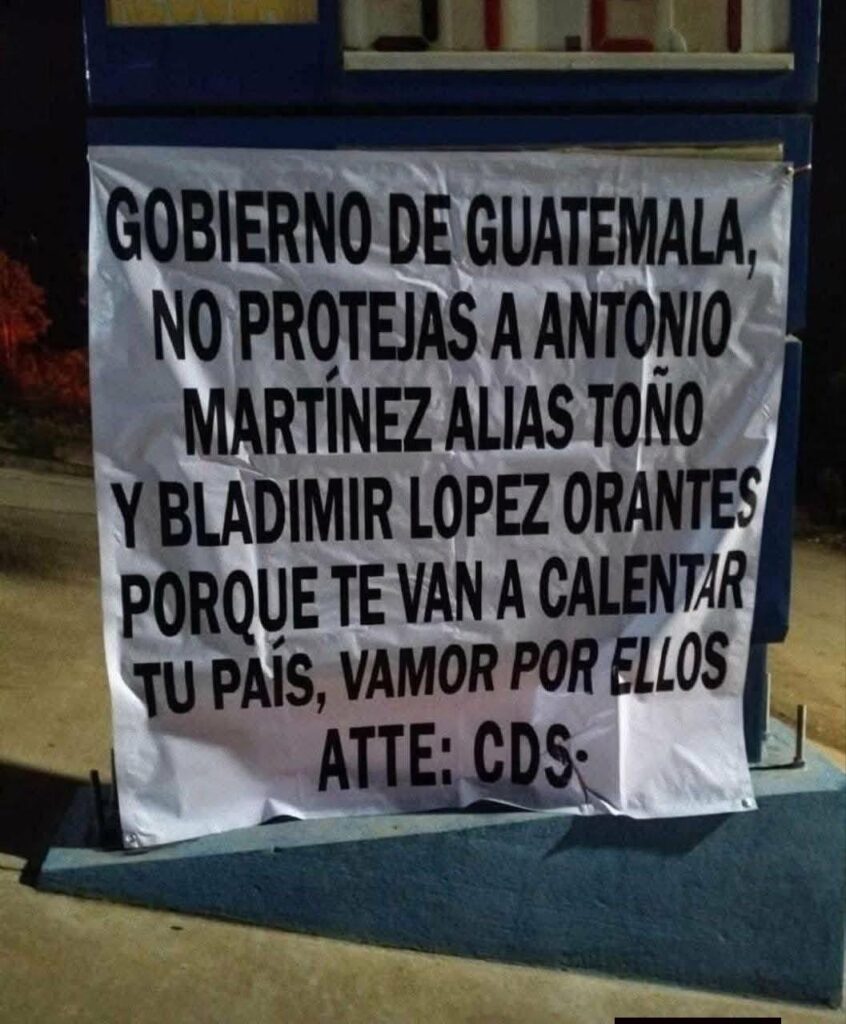 En redes sociales circularon imágenes que muestran varios vehículos calcinados, así como mantas con mensajes dirigidos a grupos rivales. “Gobierno de Guatemala, no protejas a Antonio Martínez, alias ‘Toño’, y a Bladimir López Orantes, porque te van a calentar tu país. Vamos por ellos”, se lee en una de las lonas presuntamente firmadas por el CDS.