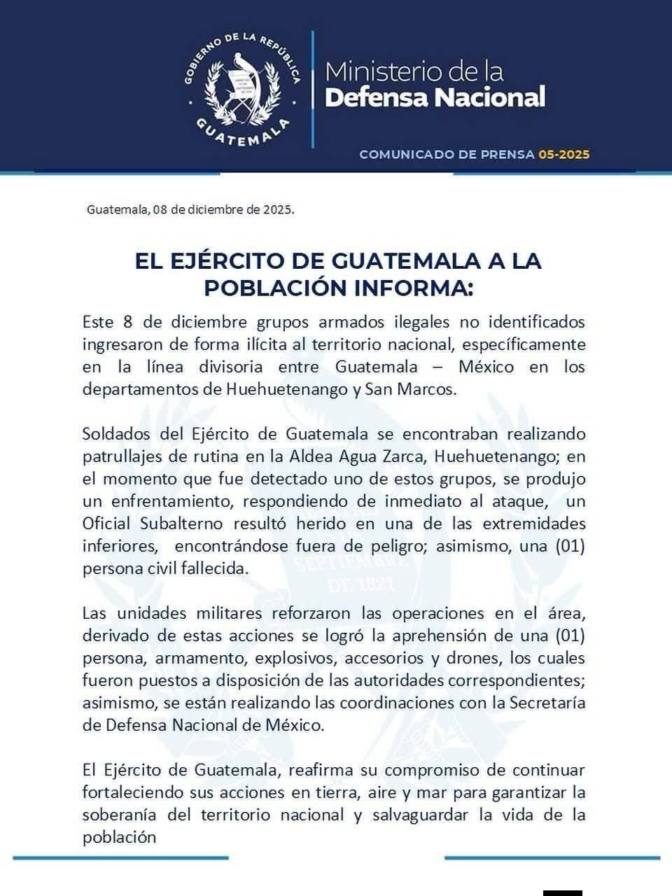 Tuxtla Gutiérrez, Chis. 8 Dic.- La disputa armada por el control de la frontera entre México y Guatemala volvió a intensificarse este lunes, cuando integrantes del Cártel de Sinaloa (CDS) incursionaron en comunidades guatemaltecas de los departamentos de Huehuetenango y San Marcos, dejando como saldo un civil muerto, un militar herido y una persona detenida, informó el gobierno de Guatemala.