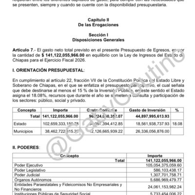 Listo el Presupuesto de Egresos 2026 para el estado de Chiapas.