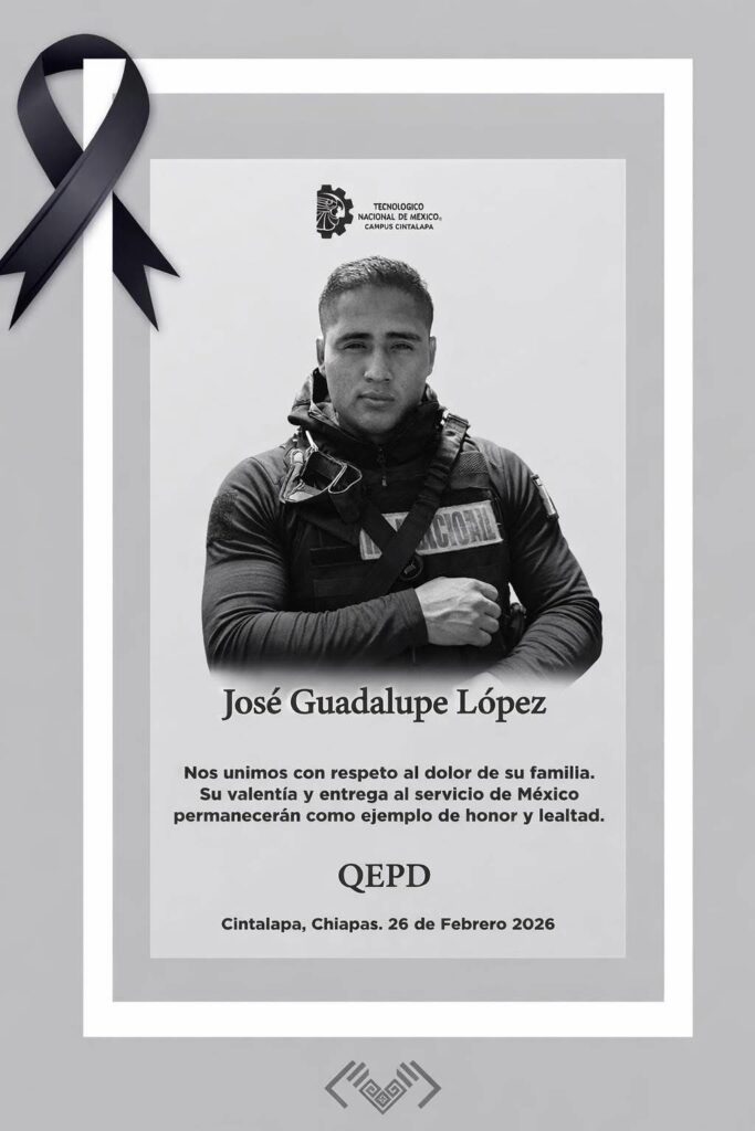 El Tecnológico Nacional de México Campus Cintalapa publicó una esquela en sus redes sociales, donde destacó la valentía, entrega y alto sentido del deber del joven elemento. “José Guadalupe es un ejemplo de honor, lealtad y amor por México, por lo que permanecerá en nuestra memoria como testimonio de servicio y compromiso con la patria”, expresó la comunidad académica.
